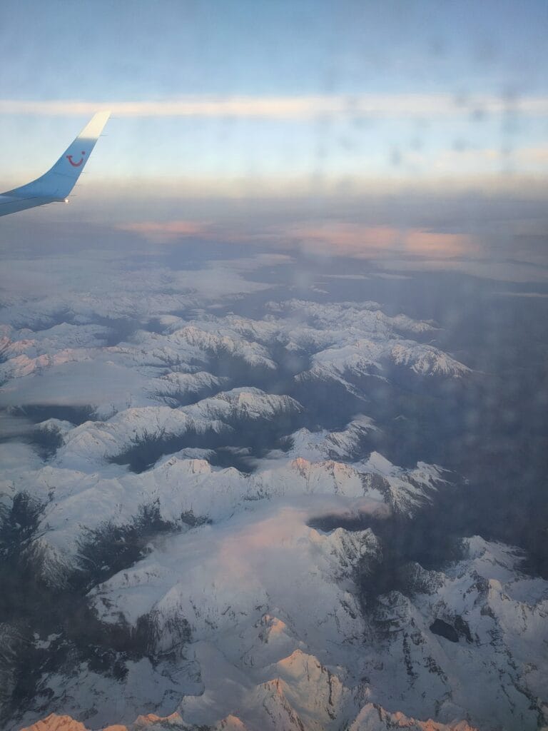 We moesten al heel vroeg in de auto naar Antwerpen. De wekker ging al om 2:45 in de nacht. Om 7:00 zaten we in de lucht. Iets over de helft hadden we geluk en was het wolkendek even open. Hierdoor konden we de prachtige besneeuwde toppen van de Pyreneeën bewonderen.
